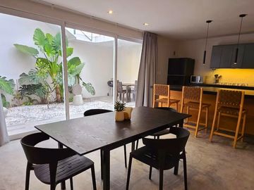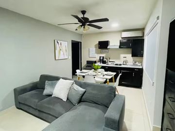 Equipado con comedor, cocina completa equipada, A/C en sala y recámaras, sofá y área de trabajo.